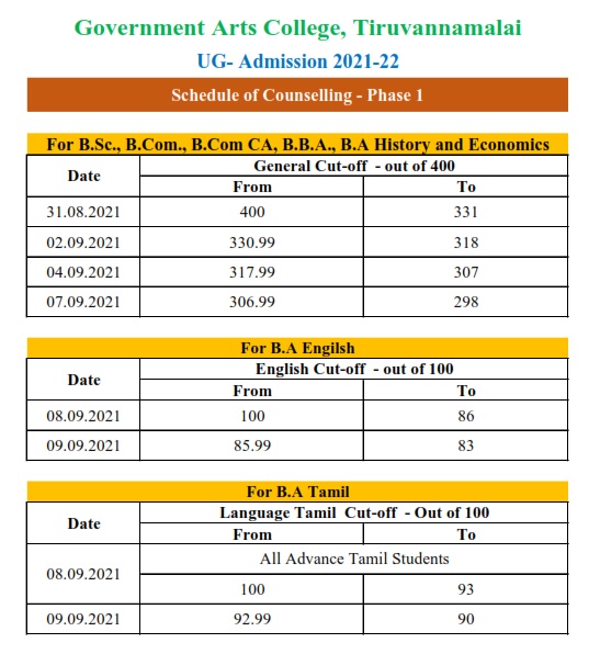UG- Admission 2021-2022, Schedule of Counselling – Phase 1